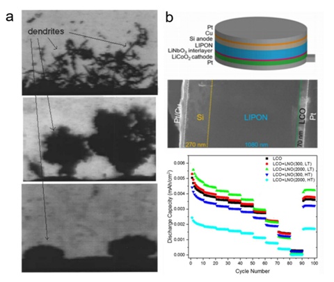 早期研究認為,具有高機械強度的固態電解質可以抑制鋰枝晶在電池中的生長,但是眾多實驗結果表明,無論在聚合物電解質,還是在無機固態電解質中,固態電解質的設計非但沒有抑制鋰枝晶的生長,反而使枝晶的生長比在傳統液態鋰離子電池中更加迅速。近期研究顯示,除界面潤濕性外,電子電導性也是影響枝晶生長的重要因素之一,電子電導率越高,鋰枝晶生長速度越快。因此,構建潤濕性良好,電子電導率低和機械強度優異的界面層對抑制鋰枝晶的生長尤為重要。