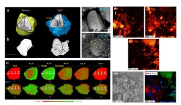 本課題組對富鎳單晶NCM622材料在充放電過程中的容量衰減以及結構不穩定性做出解釋,他們通過操作X射線光譜成像和納米斷層掃描技術以及光譜技術研究了材料的演變。發現單晶顆粒中Ni氧化態分布的不均勻性,反應異質性和高不可逆性可歸因于原始NCM晶體表面化學物質(Li+/Ni2+的紊亂)的特征,這可能會引起顆粒內部異質內部應變,并進一步導致結構/性能下降。由陽離子混合引起的混合表面相可能會抑制鋰離子的運輸,這會觸發表面相從層狀結構轉變為巖鹽結構并誘導鋰離子分布不均勻的情況(圖5)。