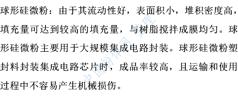 (5)應(yīng)用于集成電路覆銅板的硅微粉可分為:結(jié)晶型硅微粉、熔融型(無定型)硅微粉、球形硅微粉、復(fù)合硅微粉、活性硅微粉等五個(gè)品種。