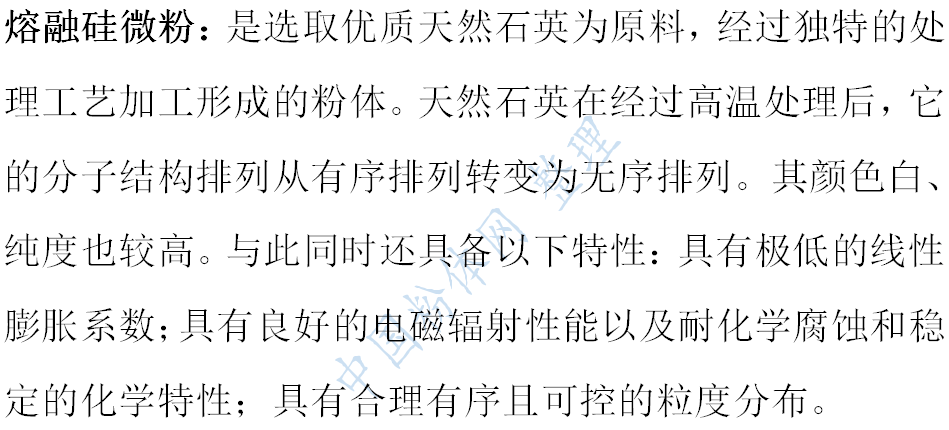 (2)根據(jù)不同制作工藝而生產(chǎn)的硅微粉其品質(zhì)也不相同,按生產(chǎn)工藝的不同可以劃分為:熔融硅微粉、結(jié)晶硅微粉、活性硅微粉、方石英硅微粉共四種。