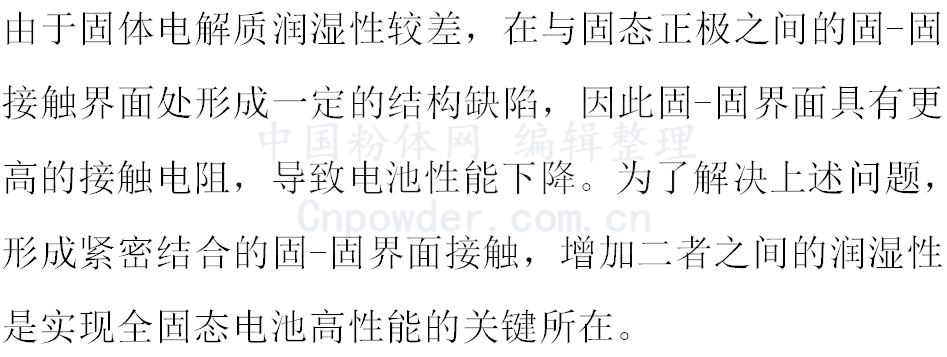 中國粉體網訊 固態電池采用固態電解質代替有機電解液,從根本上解決了傳統鋰離子電池的安全隱患,并且固態電解質與金屬鋰負極的搭配有望實現較高的能量密度;但由于固態電解質缺乏流動性,導致固-固接觸面積小,阻抗增大等問題出現,這一系列的界面問題已成為制約固態電池發展的瓶頸。