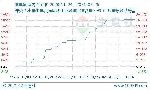 2月份螢石價(jià)格走勢(shì)小幅上漲,近期廠家反映螢石訂單情況一般,場(chǎng)內(nèi)商家出貨情況正常,場(chǎng)內(nèi)螢石貨源供應(yīng)略顯緊張,場(chǎng)內(nèi)價(jià)格走勢(shì)上漲。國(guó)內(nèi)螢石廠家運(yùn)行穩(wěn)定,場(chǎng)內(nèi)礦山和浮選裝置開工維持低位,螢石場(chǎng)內(nèi)走貨情況一般,螢石市場(chǎng)價(jià)格小幅上漲。2月份下游氫氟酸市場(chǎng)價(jià)格走勢(shì)上漲,終端下游按需采購(gòu)為主,截止月末內(nèi)蒙古地區(qū)97螢石濕粉價(jià)格在2500-2700元/噸,福建地區(qū)97螢石濕粉商談主流在2700-2900元/噸,河南地區(qū)97螢石濕粉價(jià)格在2700-2900元/噸,江西地區(qū)97螢石濕粉價(jià)格在2700-2900元/噸,近期國(guó)內(nèi)螢石價(jià)格小幅上漲。