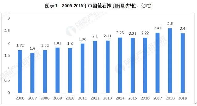 螢石礦是中國的優勢礦種。我國現有的螢石礦資源中,單一型高品質螢石礦床多、儲量少,而伴(共)生型礦床數少、儲量大。2006-2019年期間我國螢石探明儲量總體呈波動增長態勢,2019年我國螢石探明儲量為2.4億噸,同比下降8%。