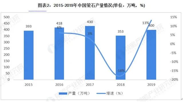 2015-2019年我國螢石產量較為波動,2019年我國螢石產量為400萬噸,同比增長13%。