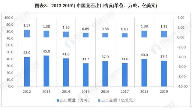 近5年來我國螢石出口量總體較為穩定,基本在30-40萬噸之間波動,出口金額有所上漲。2019年我國螢石出口量為37.4萬噸,出口金額為1.35億美元。