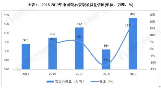 2015-2019年我國螢石表觀消費量較為波動,基本在350-450萬噸之間波動。2019年我國螢石表觀消費量為433萬噸,同比增長19%。