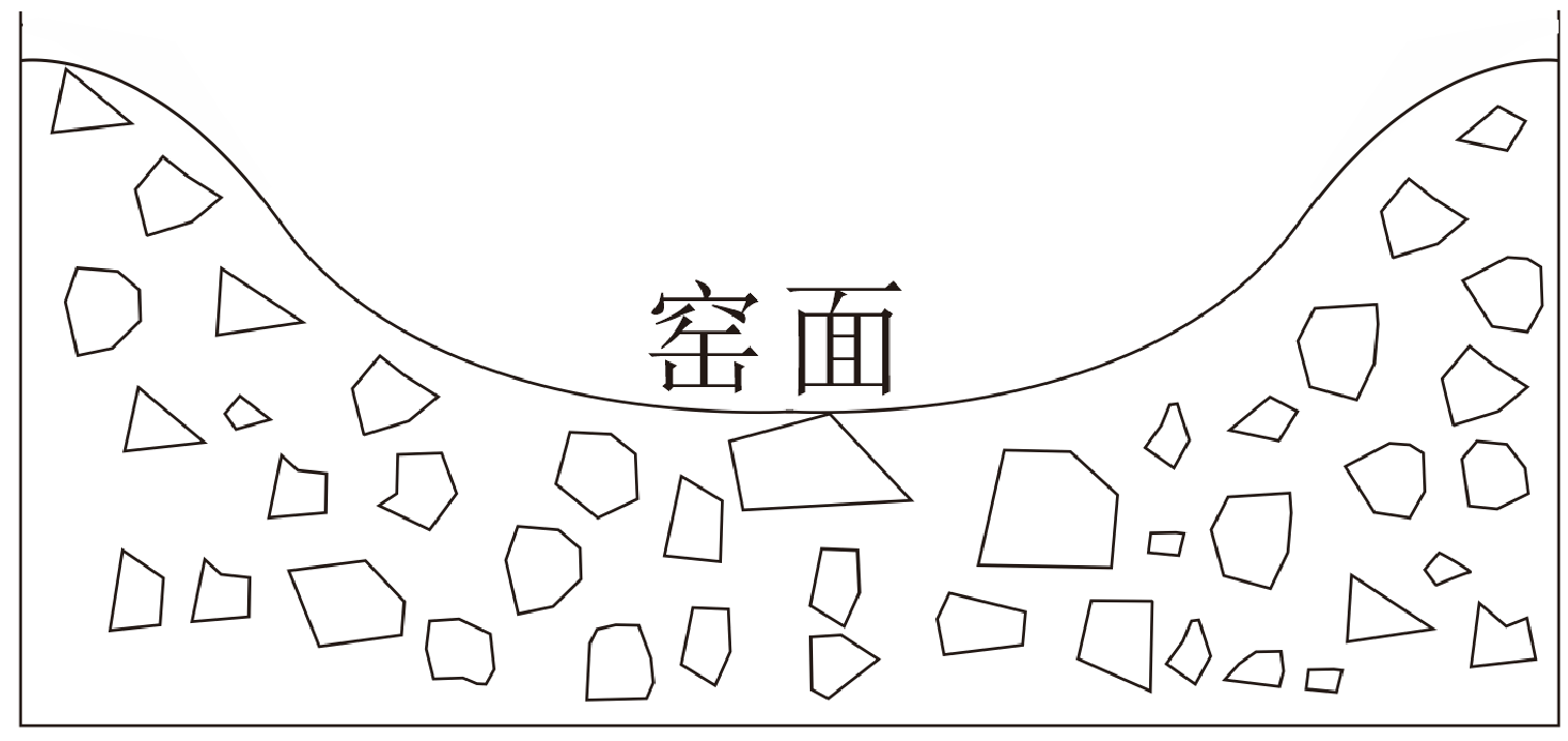 我國(guó)石灰窯爐布料器的品種很多,常見(jiàn)的有:旋轉(zhuǎn)布料、鐘式布料、馬氏(褲叉式)布料,以及各企業(yè)家、聰明人士自改的各種布料器。不管哪種布料器都要確保物料在窯內(nèi)的合理分布,適應(yīng)深加工石灰煅燒要求,并且具有可控可調(diào),靈活方便。因深加工煅燒低溫、低風(fēng)、低運(yùn)行。所以窯面最好形成淺鍋底型。如圖 2 所示,讓邊上高中間稍低。物料盡量往邊部堆積,造成煤和較小塊狀石料在四周堆積大于中間。中間大塊利于通風(fēng),溫度四周往中間傳,以達(dá)到整個(gè)窯截面溫度趨于均勻,燒成的石灰質(zhì)量好、產(chǎn)量高的效果。