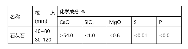 石灰石粒度要求為80-120mm或40~80mm,超出上限的部分不大于5%,超出下限的部分不大于3%。