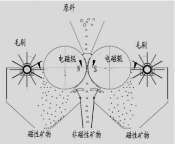 干式強磁選機在工作時,電磁輥產生產生磁通,由于感應輥的聚磁作用,在分選空間內產生高場強。隨著電磁輥轉動,非磁性物料直接通過下落,磁性物料則被電磁輥帶至非磁場區,最終被毛刷掃落,完成分選過程。