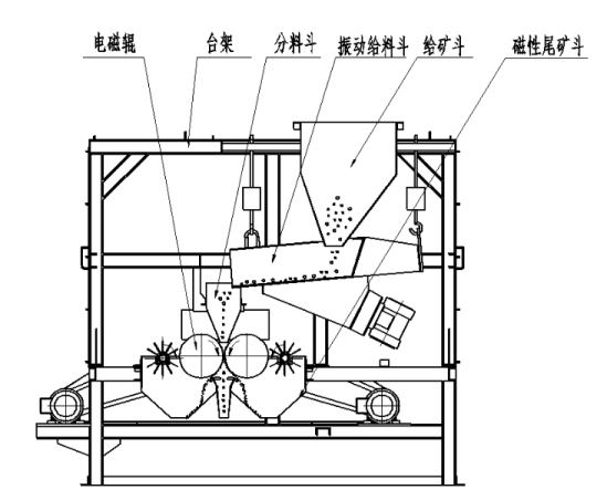 (3)給料方式是通過振動給料機實現物料在磁輥表面的均勻分布,通過控制放料板和擋條的間隙不僅能均勻給料,而且還能控制給料量的大小,保證料層厚度在合適范圍,確保最優磁選效果。