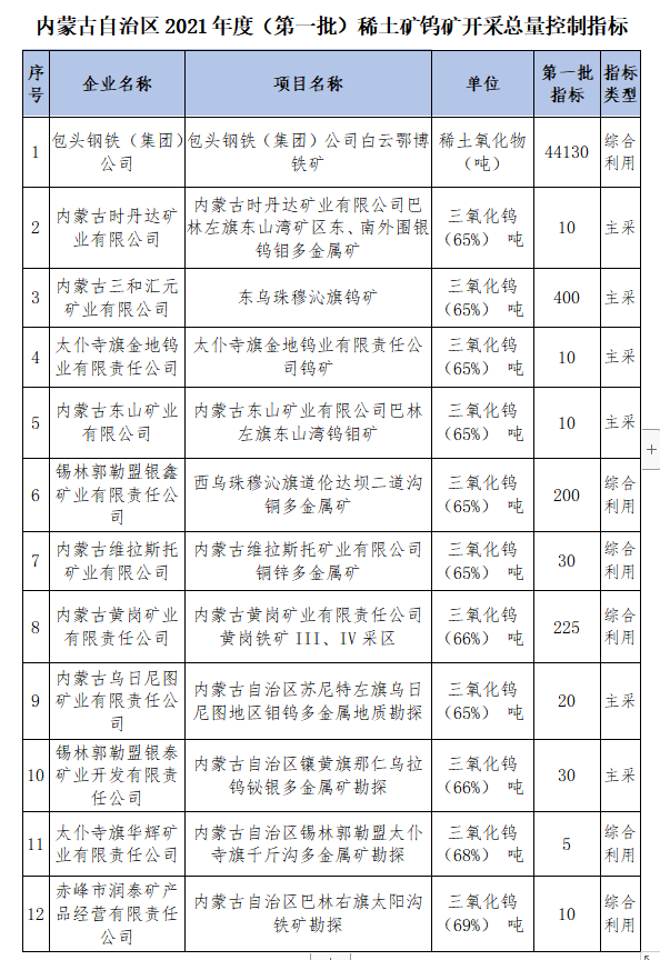 附 件:內(nèi)蒙古自治區(qū)2021年度(第一批)稀土礦鎢礦開(kāi)采總量控制指標(biāo)