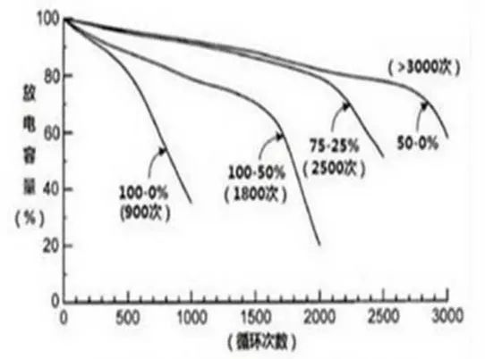 上圖為某三元鋰電池的充放電特性圖,可以看出,不同的充放電方式對電池的壽命影響不一樣,如上圖數(shù)據(jù),以25%-75%充放電的壽命可以達到2500次,即我們所說的電池淺充淺放。電池壽命這個話題我們以后還會深入討論。