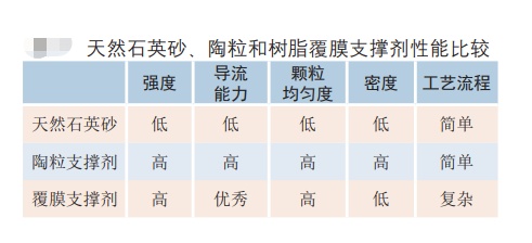 樹脂覆膜支撐劑是指在以陶粒砂等為核心的外層包裹一層可固化有機(jī)物的支撐劑,這類支撐劑的耐腐蝕、強(qiáng)度、導(dǎo)流能力等都有很大優(yōu)勢(shì),可以應(yīng)用在深層閉合壓力更大的油氣井中。樹脂覆膜砂支撐劑可滿足深層閉合高壓環(huán)境的開采需求,強(qiáng)度和耐腐蝕性均可達(dá)標(biāo)。相對(duì)于陶粒支撐劑,樹脂覆膜支撐劑相對(duì)密度更小,更便于泵注。包裹的樹脂層導(dǎo)流能力要大于未覆膜的陶粒支撐劑,且有著更強(qiáng)的耐腐蝕性。