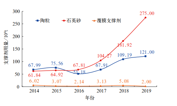 近年來(lái)隨著開采規(guī)模增大,支撐劑的銷量也在不斷增大。根據(jù)對(duì)支撐劑市場(chǎng)的調(diào)查,不同支撐劑的市場(chǎng)份額為天然石英砂占80%,陶粒支撐劑10%,覆膜樹脂砂10%,可以看出目前市面上的支撐劑還是以石英砂為主。雖然石英砂的強(qiáng)度不大,但成本低,資源廣泛,在多數(shù)的淺井開采中,石英砂就可以達(dá)到支撐劑的標(biāo)準(zhǔn)。