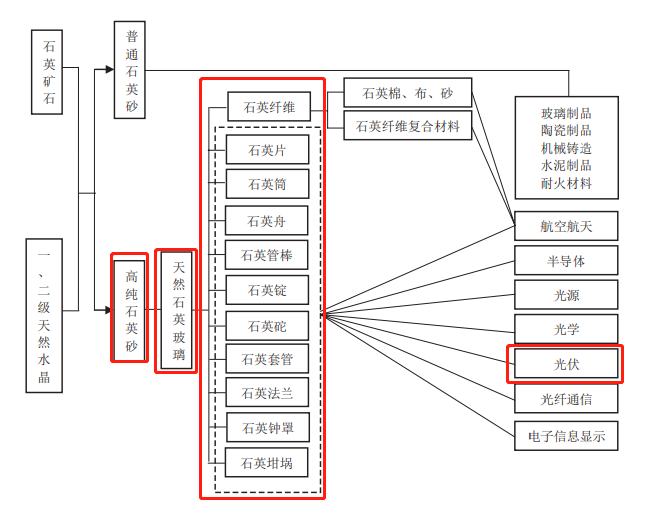 高純石英砂經(jīng)過不同的工藝流程被制作成不同的石英產(chǎn)品,應(yīng)用于各行業(yè),光伏行業(yè)便是其中的一部分。