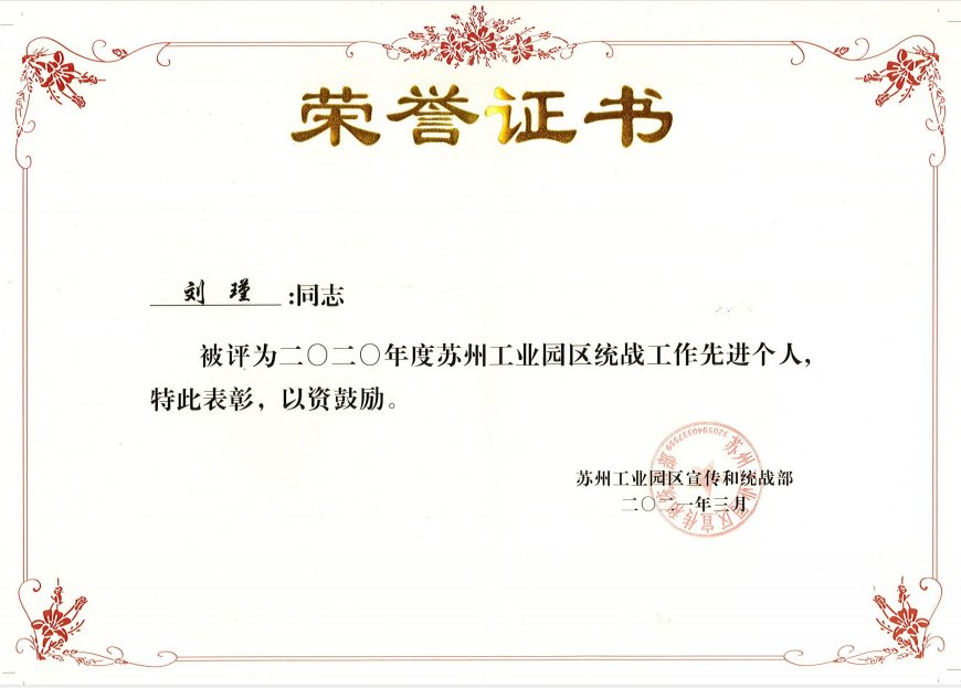 近日,蘇州工業園區召開2021年度統戰工作會議,對2020年度蘇州工業園區統戰系統先進單位、先進個人等進行了表彰。會上,蘇州協昌環保科技股份有限公司總經理劉瑾女士榮獲2020年度蘇州工業園區統戰工作先進個人。