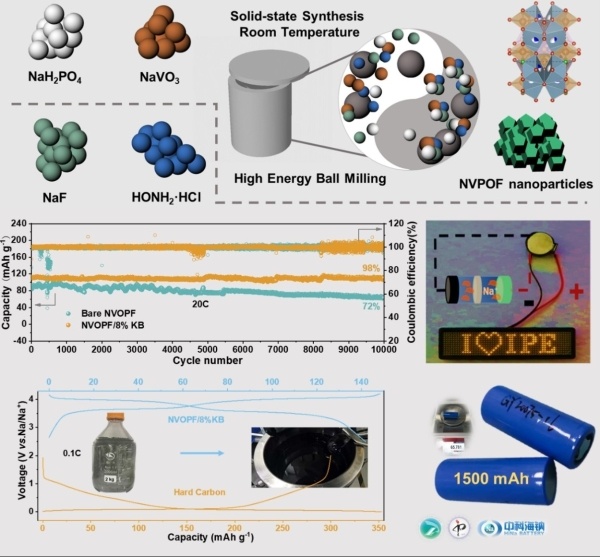 自1999年法國科學家J.-M. Le Meins發現以來,氟磷酸釩鈉的合成一直采用高溫固相法,高能耗帶來的高昂成本及欠充分發揮的電化學性能限制了該類材料的產業化應用。過程工程所研究員趙君梅團隊長期致力于NVPFs的低成本綠色合成及性能提升研究,近年來獲得了多項專利技術和研究成果。團隊以降低能耗和形貌調控為出發點,采用水熱/溶劑熱合成氟磷酸釩鈉,對材料的充放電機理進行了系統研究;在此基礎上,開發出一步室溫可控制備多殼層氟磷酸釩鈉微球技術(Joule 2018, 2(11): 2348-2363),在降低該材料生產能耗的同時提升了其性能。然而,液相反應會受到原料/產物溶解度、pH等多參數調控的限制。基于此,團隊開發出無溶劑的機械化學法以快速制備含碳NVPFs復合物,因能實現原位碳骨架的構建,界面反應得以強化。該制備方法可將液相法的7天生產時間縮短至30分鐘,產品倍率性能和循環穩定性得到提升,保證了工業應用的生產效率。產品公斤級放大組裝的商業級26650圓柱電池證實了其高功率和長循環特性。相關研究成果發表在Nature Communications上。