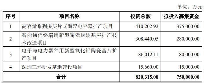 5月11日,潮州三環集團發布2021年度向特定對象發行股票預案公告,擬向特定對象發行募集資金總額不超過 75億元(含發行費用),其中,高容量系列多層片式陶瓷電容器擴產項目擬投入募集資金37.5億元,智能通信終端用新型陶瓷封裝基座擴產技術改造項目擬投入募集資金28億元,電子與電力器件用新型氧化鋁陶瓷基片擴產項目擬投入募集資金8億元,深圳三環研發基地建設項目擬投入募集資金1.5億元。