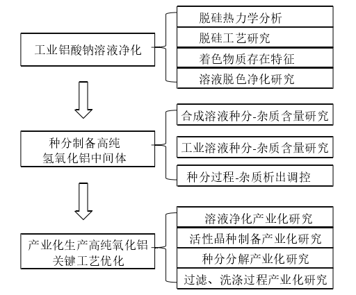 為了低成本制備高純氧化鋁粉體,有專家開展了以工業(yè)鋁酸鈉溶液為原料制備高純氧化鋁的研究。以工業(yè)鋁酸鈉溶液為原料,以脫硅熱力學為基礎,進行溶液的凈化脫色,研究種分分解過程,并對產(chǎn)業(yè)化流程進行優(yōu)化改進,生產(chǎn)出高純氫氧化鋁中間體,經(jīng)焙燒得到高純氧化鋁,其技術路線圖如下: