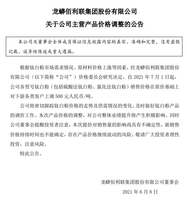 中國粉體網(wǎng)訊 龍蟒佰利6月8日晚間發(fā)布公告稱,自2021年7月1日起,公司各型號鈦白粉(包括硫酸法鈦白粉、氯化法鈦白粉)銷售價格在原價基礎(chǔ)上對下游各類客戶上調(diào)500元人民幣/噸。