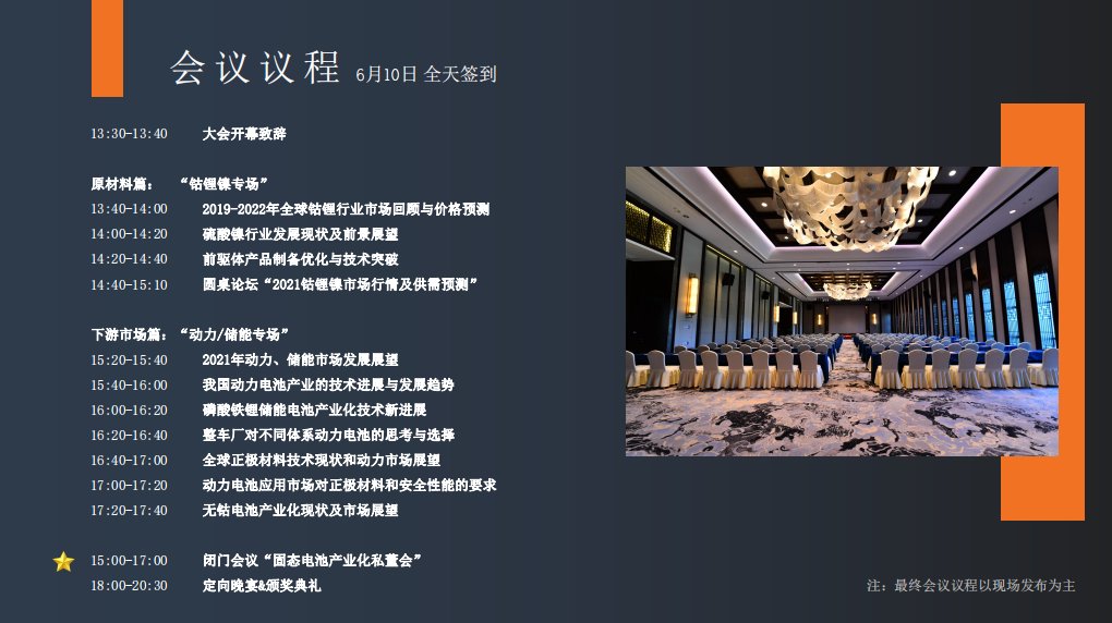 2021年度旺材正極材料及其配套企業行業評選頒獎典禮將會在首日歡迎晚宴上同期舉行。