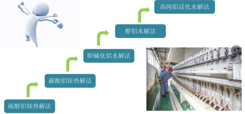 (4)鋁酸鈉溶液種分制備低堿氫氧化鋁,活化焙燒-弱酸洗滌,超細(xì)氧化鋁的純度可達(dá)99.999%。以工業(yè)氫氧化鋁為原料,通過水熱法轉(zhuǎn)化勃姆石,再活化焙燒;或通過轉(zhuǎn)化水合碳鋁銨,再活化焙燒,活性氧化鋁純度可達(dá)99.99%;