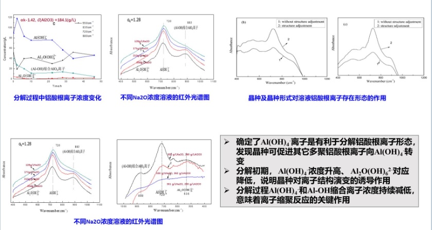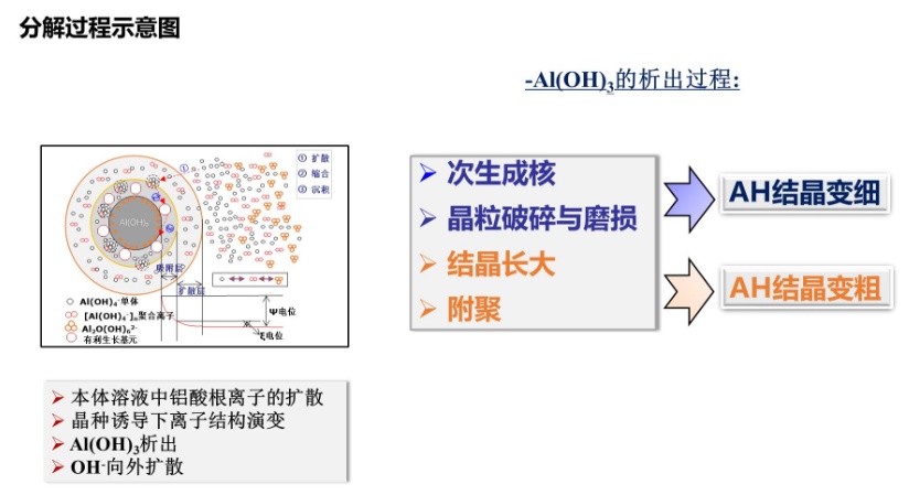 接下來,劉教授詳談了種分機(jī)理,明確鋁酸鈉溶液種分過程中鋁酸根離子反應(yīng)行為,分析粒子附聚和生長規(guī)律,闡明三水鋁石和勃姆石析出過程中形貌調(diào)控原理;以工業(yè)鋁酸鈉溶液制備了大于4N高純氧化鋁粉末,同時(shí)報(bào)告高白超細(xì)氫氧化鋁、勃姆石的產(chǎn)業(yè)化過程。