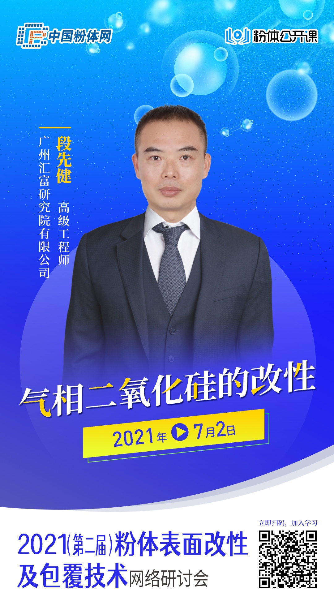 2021年7月2日,中國粉體網旗下粉體公開課平臺將舉辦“2021第二屆粉體表面改性及包覆技術網絡研討會”,屆時來自廣州匯富研究院有限公司的段先健高級工程師將作《氣相二氧化硅的改性》報告,詳細介紹氣相二氧化硅制備工藝、產品特性、產品表面改性技術及產品應用。