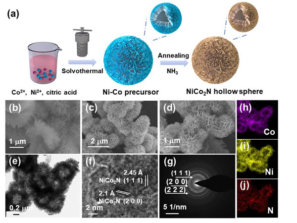 圖1. (a) NiCo2N材料的合成示意圖;(b) Ni-Co前驅體的SEM圖像;NiCo2N材料的(c-d) SEM,(e)TEM,(f)HRTEM,(g) SAED圖像,(h-j)Co、Ni、N元素的EDX圖。