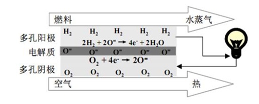 固體氧化物燃料電池的工作原理與其他燃料電池相同,在原理上相當(dāng)于水電解的“逆”裝置。其單電池由陽極、陰極和固體氧化物電解質(zhì)組成,陽極為燃料發(fā)生氧化的場所,陰極為氧化劑還原的場所,兩極都含有加速電極電化學(xué)反應(yīng)的催化劑。工作時相當(dāng)于一直流電源,其陽極即電源負(fù)極,陰極為電源正極。
