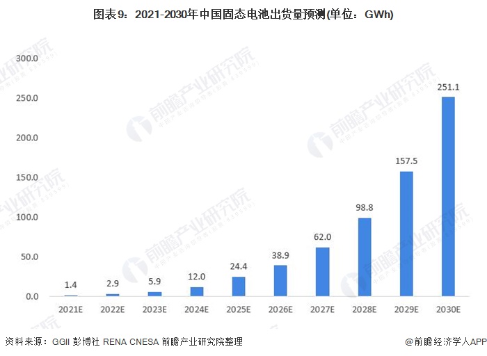 目前,全球企業開始加大固態鋰電池方面的研究布局,加上各國政策的推動下,固態鋰電池產業化進程有望加快。預計2021-2030年我國固態電池出貨量高速增長,至2030年或將突破250GWh。