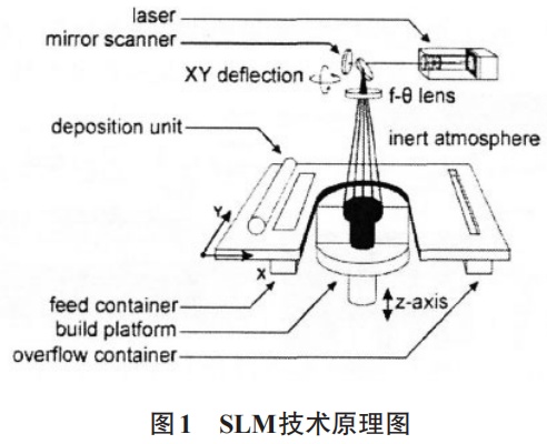 在金屬增材制造中,SLM是應用最普遍的技術之一,由Fraunhofer研究所于1995年在德國提出,利用激光選區熔化打印金屬材料,圖1為其技術原理圖。SLM技術的激光器能量密度很高,能夠直接用激光熔化粉體,不需要粘結劑,具有很高的成形性能。經過SLM技術制備的零件具備相當高的致密度,力學性能優異,非常適合實際工程應用。