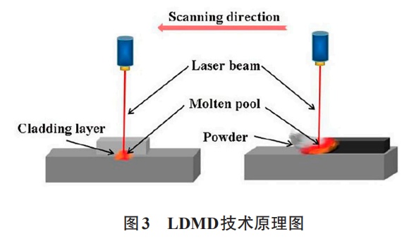LDMD技術也稱為激光堆焊技術,早在二十世紀六十年代就被提出,通過使用高能激光在兩個金屬材料表層之間形成熔覆層,然后經快速固化得到性能良好的涂覆層。但是受到工藝與殘余應力等影響,熔覆層常常存在缺陷,在成形精度、成本等方面仍有不足。技術原理圖見圖3。