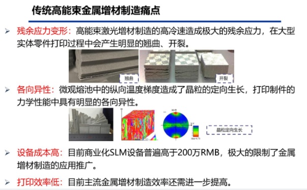由于中國市場對金屬材料 3D 打印的接受度仍處于初期階段,3D 打印技術在中國生產制造行業的滲透率的確還遠不如美國、德國等國家。傳統高能束金屬增材制造痛點如下圖: