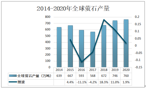2015-2017年全球螢石產量不斷下降,隨后逐年上升,2019年全球螢石產量為746萬噸,同比增長11%;2020年全球螢石產量為760萬噸,同比增長1.9%。