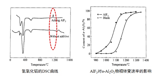 以AlF3為例,將氫氧化鋁與AlF3混合、高溫煅燒制備α-Al2O3。高溫煅燒過程中加入AlF3后,氧化鋁相變溫度從1300℃降低至1150℃。