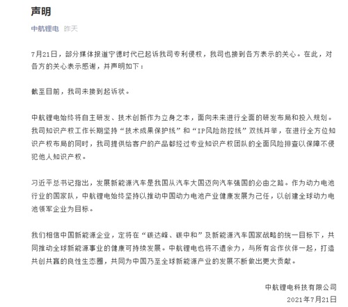 “寧德時代已就中航鋰電專利侵權案遞交起訴書,案件已受理。涉案專利涉及發明與實用新型專利,此次涉嫌侵權電池已搭載在數萬輛車上。”寧德時代公關人士稱,對于寧德時代而言,知識產權是企業提高核心競爭力的戰略資源,也是企業面對激烈國際競爭的重要支撐,“長期以來,寧德時代高度重視知識產權的保護工作,同時積極加強知識產權合作,推動產業健康有序發展”。