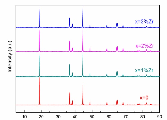 通過對LiNi0.8Co0.1Mn0.1O2摻雜ZrO2發現(下圖),是在不同摻雜ZrO2量下合成的目標正極材料的XRD圖譜,在不同摻雜量下各個材料的XRD特征峰大致相同,經過Jade分析后屬于六方晶系的α-NaFeO2型的層狀結構,沒有其它的雜峰,說明ZrO2摻雜后的材料沒有影響到原始材料的整體結構。