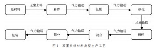 以生產石墨負極材料為例,作出分析。石墨負極材料典型生產工藝見圖1。