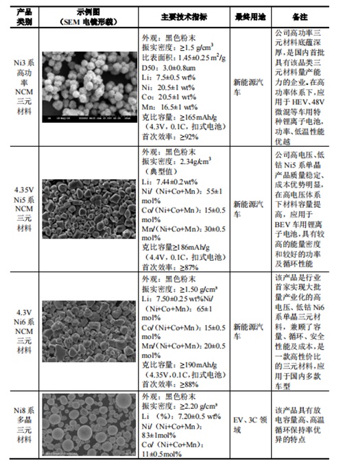 在BEV領域,目前行業用量最多的類型為Ni5系NCM三元材料,而公司目前以高電壓Ni6系NCM三元材料為主,并已具備Ni7系、Ni8系NCM三元材料的量產能力。在HEV領域,電池正極更多的是使用高功率NCM三元材料,主要通過細化其一次晶粒、提升比表面積、縮小粒徑等技術路線來實現高功率、高倍率性能。此外,公司還逐步將高功率NCM三元材料導入新型民用電動工具領域,已形成小批量生產。