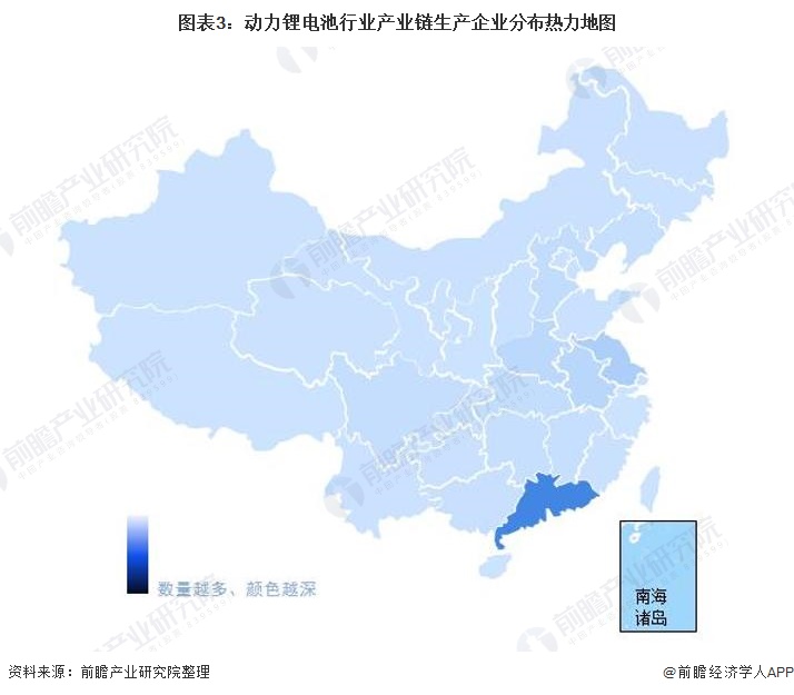動力鋰電池行業產業鏈區域熱力地圖:廣東分布最集中