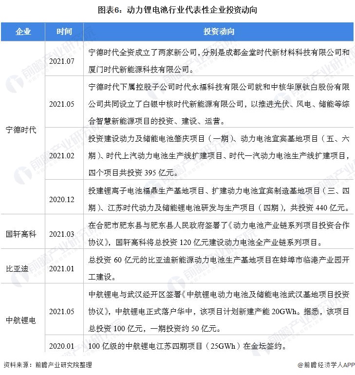 近年來,動力鋰電池行業代表性企業的投資動向主要包括投資新建產能項目、成立公司拓展業務。動力鋰電池行業代表性企業最新投資動向如下: