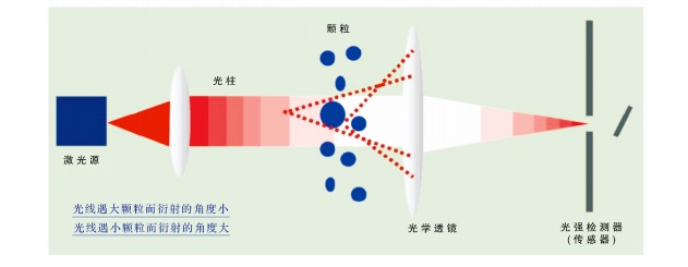 激光衍射法粒度分析常用的儀器是激光粒度分析儀,由分析儀產生的經光路變換為平面波的單色平行光,在通過樣品時發生衍射、散射,相同粒徑所產生的衍射、散射光落在相同的位置上,并由布置在不同方向的光電探測器接收;然后探測器將衍射、散射信息傳給計算機;通過計算在不同方向所獲取的光位置和強度信息可得出樣品中不同粒級的體積分數和顆粒體積,根據等效圓球理論(米氏理論)換算出樣品顆粒的粒度分布。