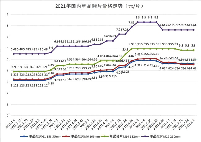 硅片方面,8月11日,中環(huán)股份公布8月單晶硅片定價(jià),與7月17日公布的報(bào)價(jià)相比,M6每片上漲0.44元;相較于6月報(bào)價(jià),G12每片上漲0.44元,G1每片上漲0.26元。