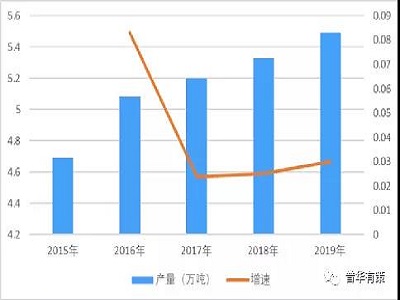 ▲2015-2019年我國銅基金屬粉體材料產(chǎn)量
