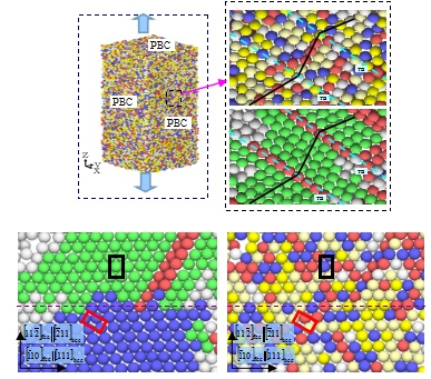 多主元高熵亞穩(wěn)材料因其新奇的結(jié)構(gòu)和優(yōu)異性能,是目前材料學(xué)屆的研究熱點(diǎn)。FCC高熵合金高的室/低溫塑性來(lái)源于密集納米孿晶的生成,但缺乏對(duì)孿晶生成過(guò)程和作用機(jī)制的認(rèn)識(shí)。實(shí)驗(yàn)室通過(guò)與英國(guó)鉆石光源合作,采用原位中子衍射和高分辨透射電鏡技術(shù),闡明了FCC高熵合金室/低溫拉伸和大塑性變形時(shí)納米孿晶和微帶共同作用的機(jī)制,提出了納米孿晶和微帶協(xié)同提高材料塑性的新材料設(shè)計(jì)理念;同時(shí)在國(guó)際上率先基于分子動(dòng)力學(xué)構(gòu)建了高熵合金納米尺度變形模型,闡明了FCC→BCC的相變誘發(fā)塑性、變形誘導(dǎo)非晶化等機(jī)制。