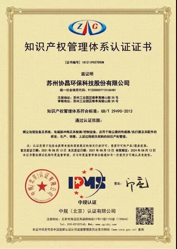 近日,蘇州協昌環(huán)?萍脊煞萦邢薰緲s獲《知識產權管理體系認證證書》,這表示協昌環(huán)保知識產權管理體系符合標準:GB/T 29490-2013。煙塵治理設備及系統(tǒng)、電磁脈沖閥及其檢測/控制設備、應用于除塵器的傳感器/執(zhí)行器及其配件的研發(fā)、生產、銷售、上述過程相關采購的知識產權管理通過認證。