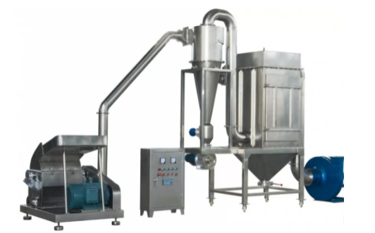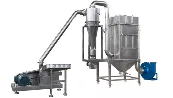粉碎后的粉體由負壓輸送到旋風和布袋除塵器收集,經排料閥排出。該機組是制藥、食品、化工等行業的理想微粉碎設備。