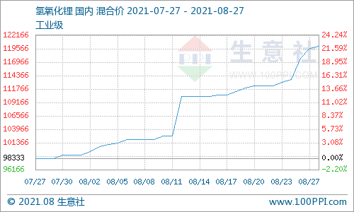 截止到8月27日,國內(nèi)工業(yè)級氫氧化鋰企業(yè)均價為120000.00元/噸,與周一價格相比上漲了6.19%,與7月27日相比上漲了22.03%,以三個月為周期同比上漲了37.40%。