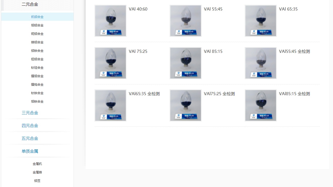 公司專注于研發生產合金產品(鋁釩合金、鋁鉬合金、釩鐵合金、鋁鈮合金、鋁鉭合金、硅鈦合金、鋁鐵合金、釩鉻合金、鋁鉬釩合金、鋁鉻合金、鋁鈮鉭合金、釩鋁鐵合金、鋁釩錫銅鐵合金、鎳硼合金、鎳鈮合金、鎳鎢合金、鎳鉬合金)及金屬材料(金屬釩、金屬硅、電解錳、金屬鉻、鋁豆、鋁粒)。廣泛應用于航天工程、戰機、大飛機、生物醫療等重大高科技項目。隨著鈦合金以及高溫合金應用領域的拓展和延伸,對關鍵中間合金材料的品質提出了更高的要求,為滿足客戶需求該公司從德國引進了國際先進的中間合金生產線,并迅速形成合金產品的規模化和產業化、并實現全過程自動化控制的流水線生產方式,產品質量在國際同類產品中處于領先水平,已發展成為中國航空航天級中間合金制造領軍者,并可提供量身定制的中間合金及應用領域全方位的技術支持。